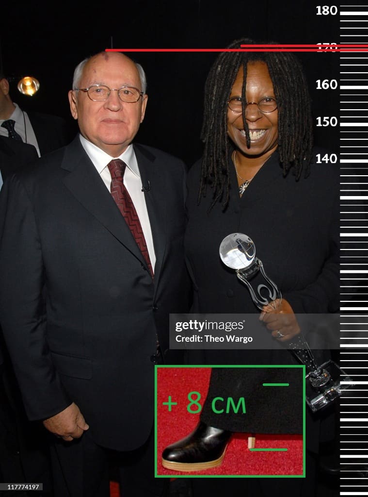 Михаил Горбачёв в последние годы был немного выше, а именно 168 сантиметров(170 в обуви). Рост Вупи Голдберг без каблуков будет также на отметке 163 сантиметра.