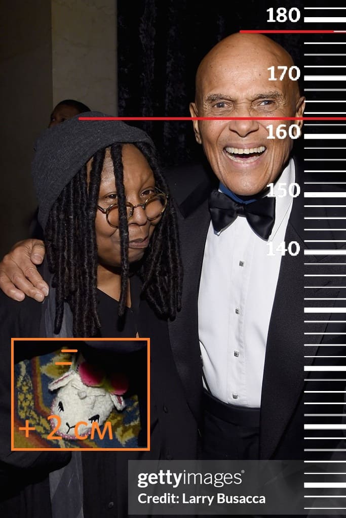 Рост Гарри Белафонте в последние годы жизни составлял 178 сантиметров. Здесь Вупи Голдберг на 15 сантиметров ниже него, и её рост также будет 163 сантиметра.