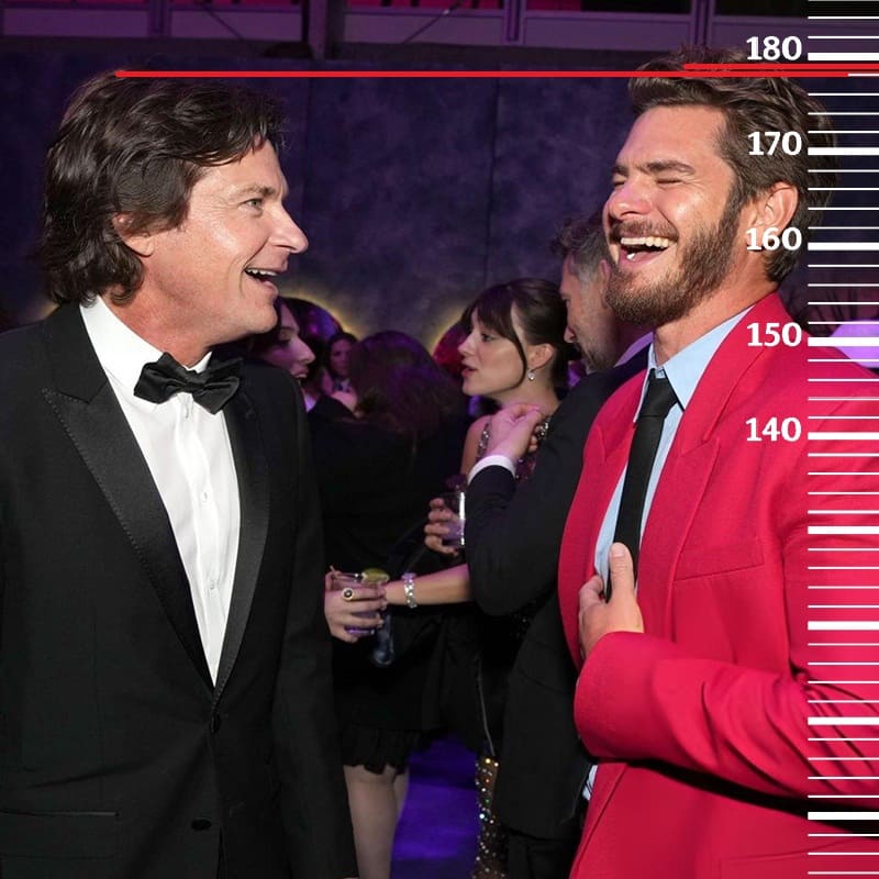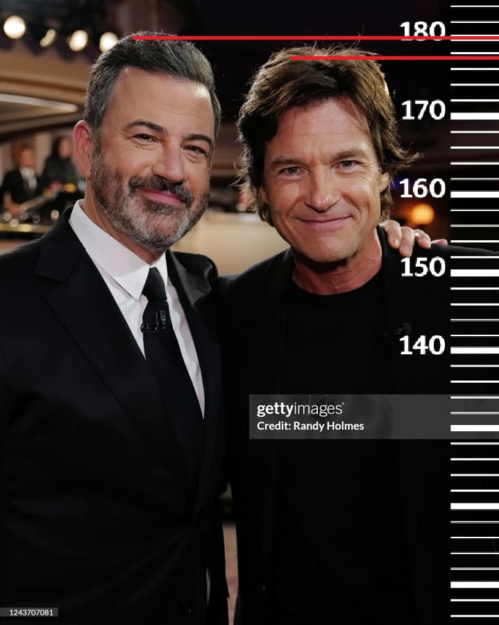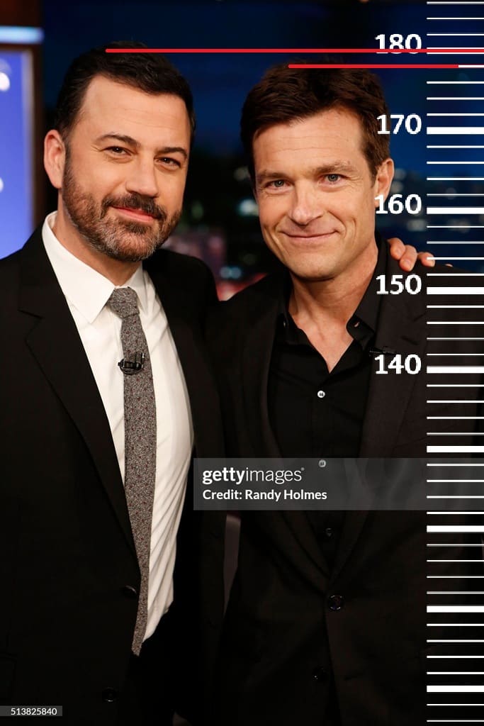 Далее рассмотрим 6 фото, где сравним Джейсона Бейтмана с Джимми Киммелом, рост которого максимум 180 сантиметров с утра. Во всех шести случаях рост Джейсона будет 177.5-178 сантиметров.