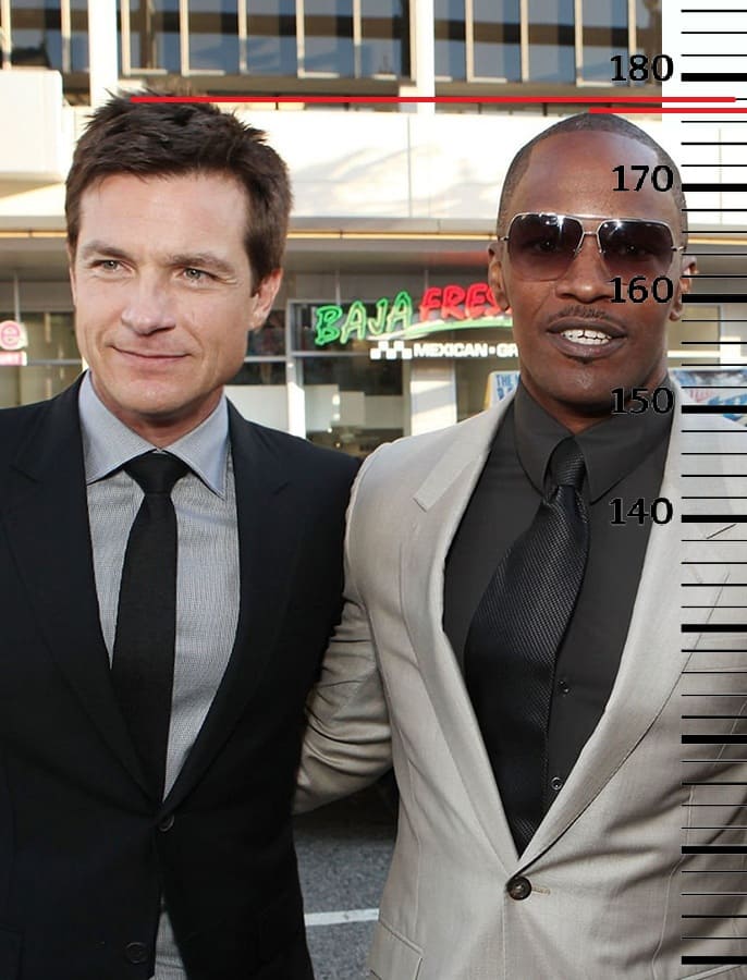 Джейми Фокс(1 фото) и Джуд Лоу(2 фото) имеют одинаковый рост по 177 сантиметров каждый. В обоих случаях Джейсон Бейтман едва ли выше них.