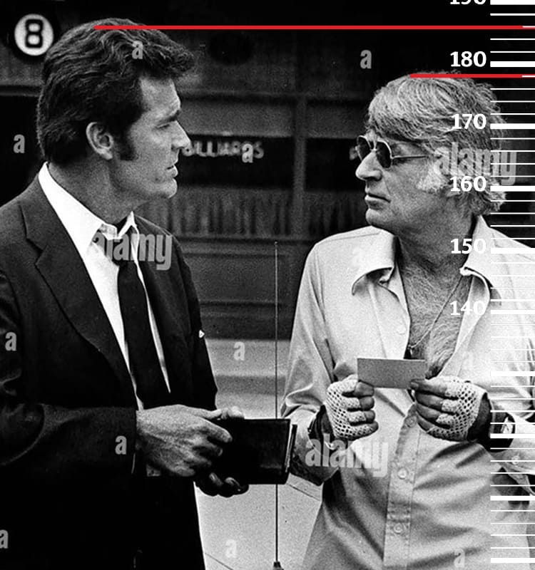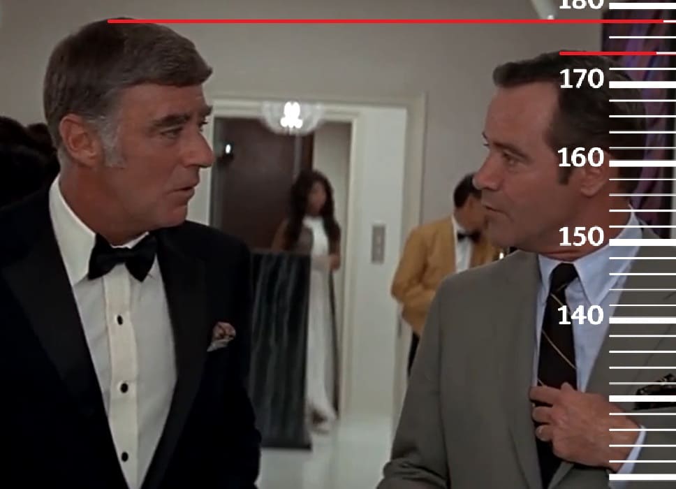В 1972-м году сравним 49-летнего Питера Лоуфорда с 44-летним Джеймсом Гарнером, рост которого тогда последние годы держал свою пиковую отметку в 186 сантиметров(180 в поздние годы). Здесь рост Питера также встал на отметку 178 сантиметров.