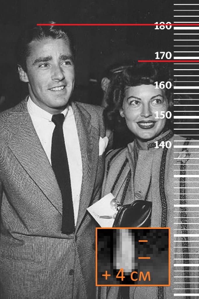 В 1956-м году сравним 33-летнего Питера Лоуфорда с 34-летней Авой Гарднер, имевшей тогда свой пиковый рост 165 сантиметров(169 на каблуках, 162 в конце жизни). Здесь рост Питера будет 181 сантиметр в обуви и 179 сантиметров без неё.