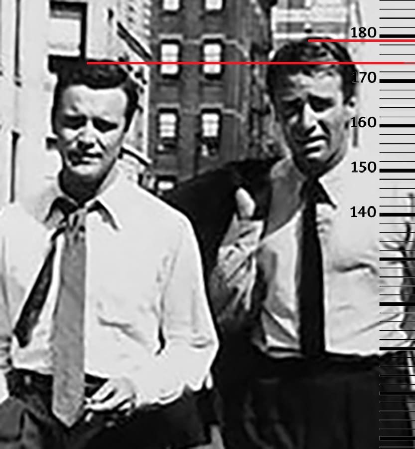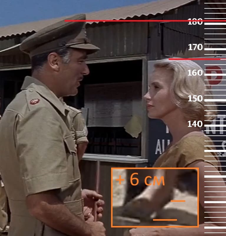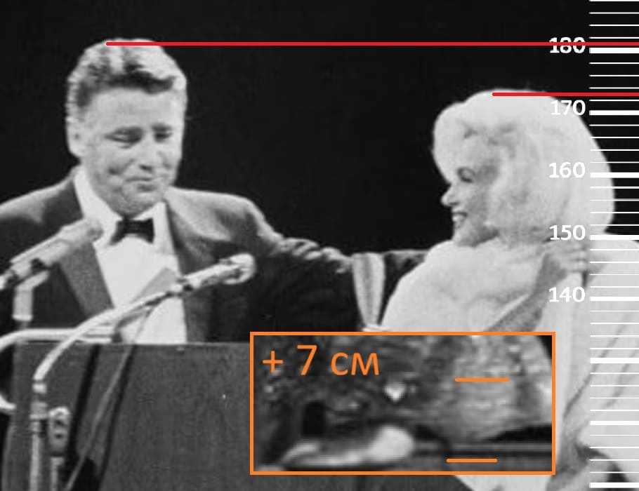 В 1962-м году сравним 39-летнего Питера Лоуфорда с 36-летней Мэрилин Монро, имевшей при жизни рост 166 сантиметров(173 на каблуках). Здесь такая же ситуация - рост Питера будет 181 сантиметр в обуви и 179 сантиметров, если её исключить.