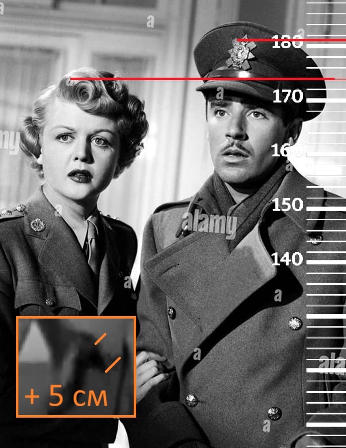 В 1949-м году сравним 26-летнего Питера Лоуфорда с 24-летней Анджелой Лэнсбери, имевшей тогда свой пиковый рост 169 сантиметров(174 на каблуках, 163 в последние годы жизни). Здесь рост Питера будет уже 181 сантиметр, но если убрать из этого значения его обувь, то его рост будет также не выше 179 сантиметров.