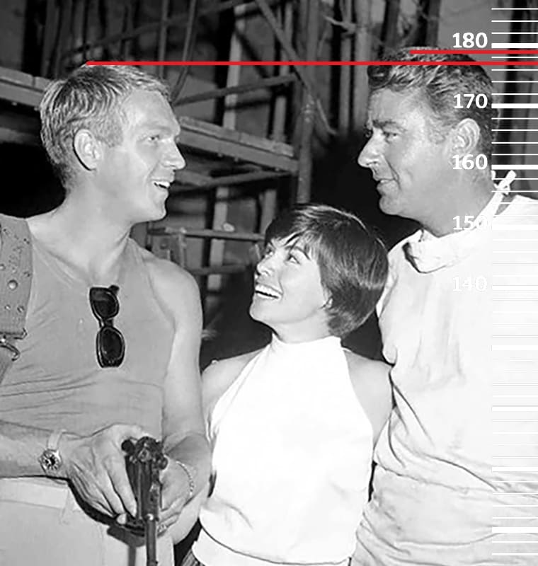 В 1959-м году сравним 36-летнего Питера Лоуфорда с 29-летним Стивом Маккуином, имевшим тогда свой пиковый рост 177 сантиметров(176 в последние годы жизни). Здесь рост Питера также будет на пике формы - 179 сантиметров.