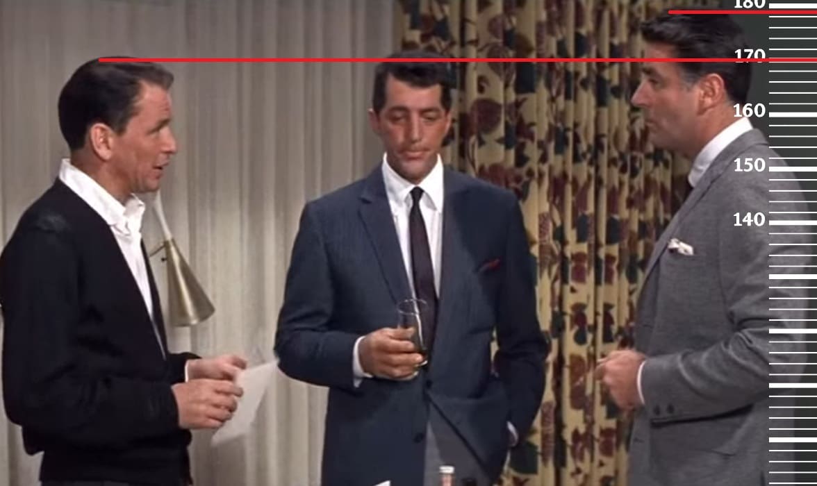 Годом позже, в 1960-м году, сравним 37-летнего Питера Лоуфорда с вышеупомянутым, но уже 45-летним Фрэнком Синатрой(1 фото) и 35-летним Полом Ньюманом(2 фото). Рост обоих сравниваемых с Питером мужчин на тот момент - пиковый, а именно 170 и 177 сантиметров, соответственно (166 и 173 в последние годы). В обоих случаях рост Питера будет на тех же 179 сантиметрах.
