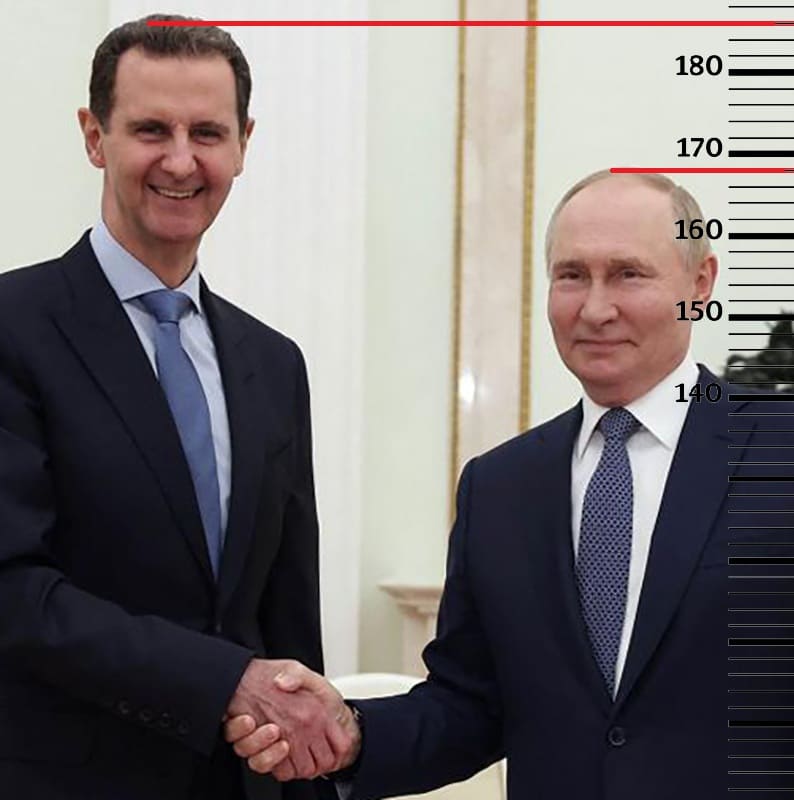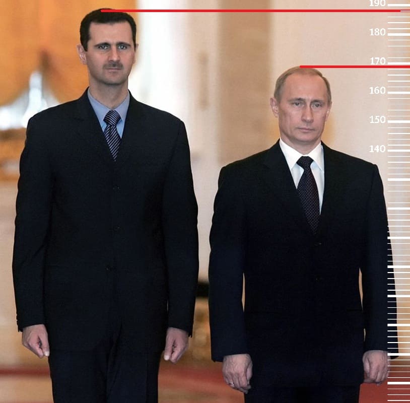 Для начала сравним Башара Асада с Владимиром Путиным, рост которого достигает максимальной отметки 168 сантиметров. Как можем видеть, рост Башара будет 186 сантиметров, что немногим ниже отметки в сети. Однако не будем забывать, что на момент фото Асаду уже далеко за 50, а значит в молодости он явно был повыше. Но об этом позже.