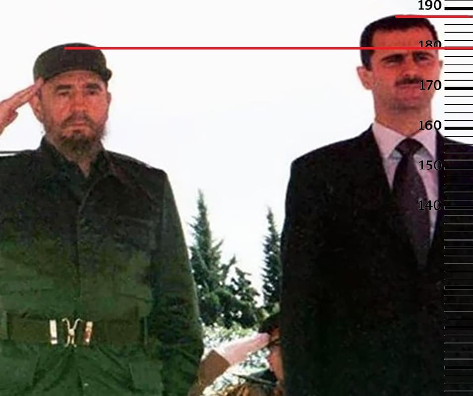 Начнём с 2001-го года. Сравним 36-летнего Башара Асада с 75-летним Фиделем Кастро, рост которого в те годы был 180 сантиметров. Как можем видеть, здесь рост Асада будет уже 188 сантиметров, которые также упоминаются в сети. Ну и поскольку в 36 лет его рост явно был на пике формы, то можно смело делать вывод, что выше этих 188 сантиметров по жизни Башар Асад точно не был.