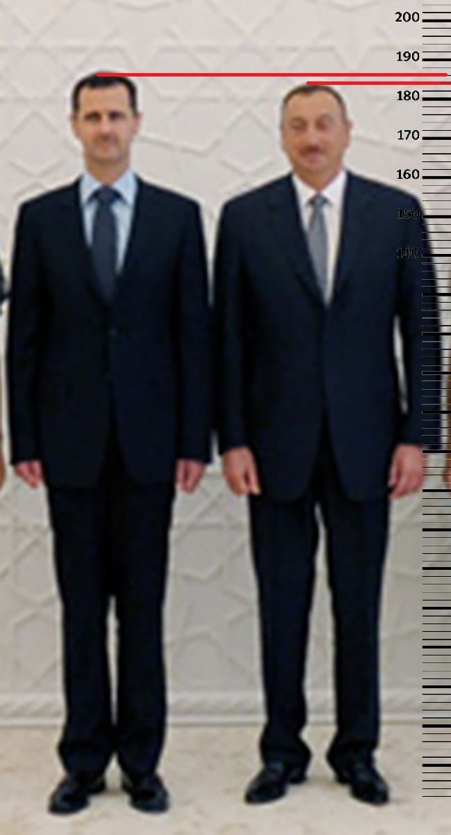 Сравним Башара Асада с Ильхамом Алиевым, рост которого составляет 184 сантиметра. В сравнении с ним рост Асада по-прежнему на отметке 186 сантиметров.