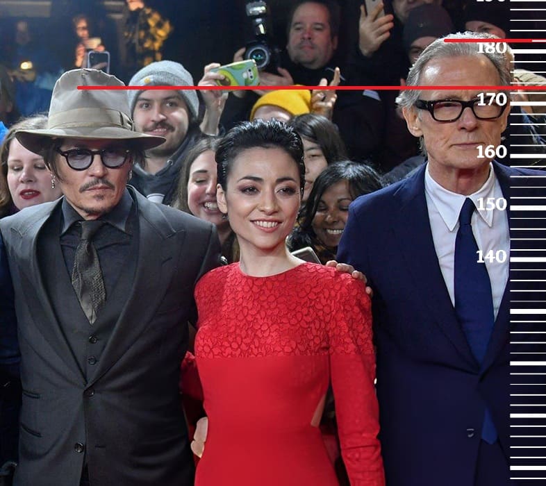 Джонни Депп немного выше, а именно 173 сантиметра. Здесь рост Билла Найи неизменно держит за собой отметку 182 сантиметра.
