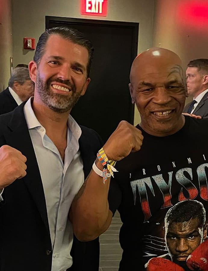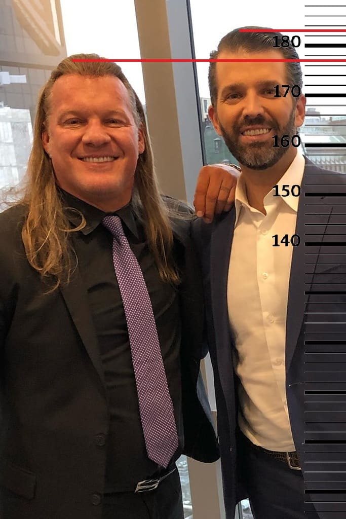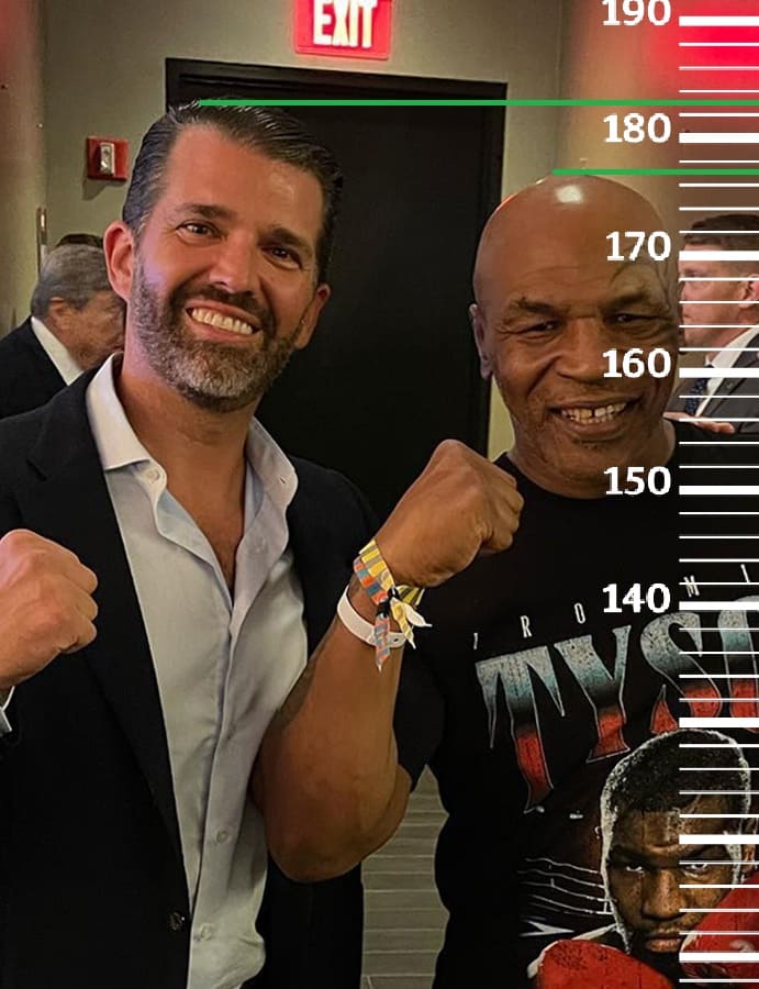 Крис Джерико(1 фото) и Майк Тайсон(2 фото) имеют одинаковый рост по 177 сантиметров каждый. В обоих случаях рост Дональда Трампа-младшего в сравнении с ними будет также 183 сантиметра.