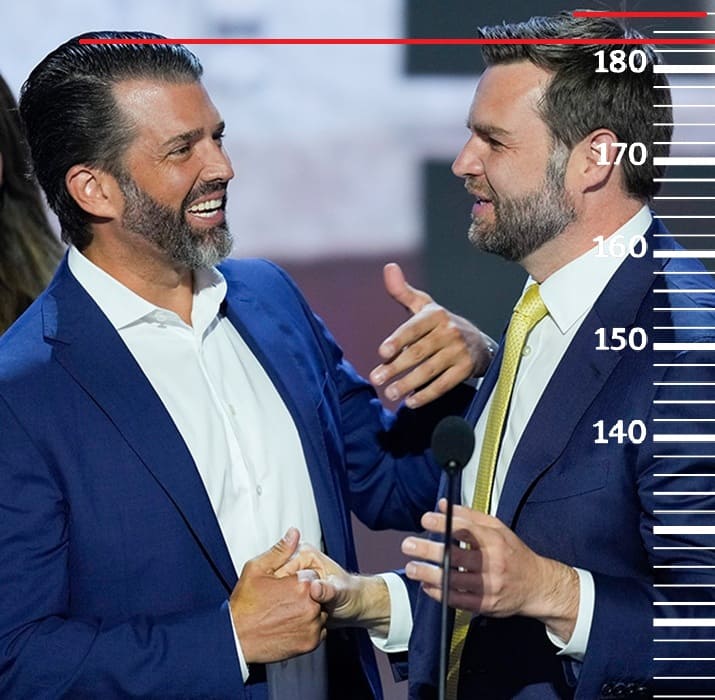 Напоследок, сравним Дональда Трампа-младшего с Джей Ди Вэнсом, максимальный утренний рост которого равен 186 сантиметров. Здесь ситуация не меняется, и рост Дональда-младшего будет также 183 сантиметра.