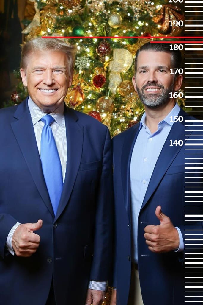 Для начала сравним Дональда Трампа-младшего с человеком, рост которого на самом деле равен 185 сантиметров. Этот человек - отец Дональда-младшего - Дональд Трамп. Как можем видеть, сын ниже отца на 2 сантиметра, что ставит рост Трампа-младшего только на отметку 183 сантиметра (тем самым подтверждая самую низкую отметку его в сети).