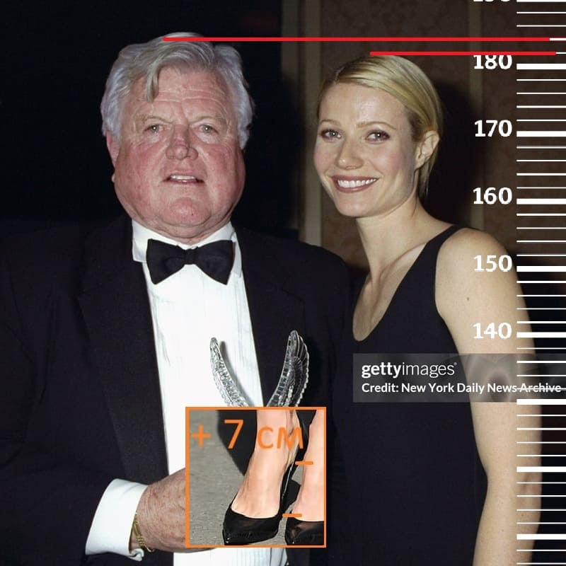 Годом позже, в 2000-м году, сравним 68-летнего Эдварда Кеннеди с 28-летней Гвинет Пэлтроу, рост которой тогда, как и сейчас, равен 175 сантиметров(182 на каблуках). Здесь рост Эдварда будет 184 сантиметра в обуви и также 182 сантиметра без неё.