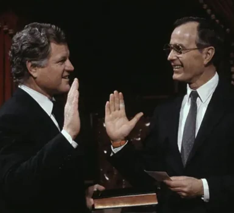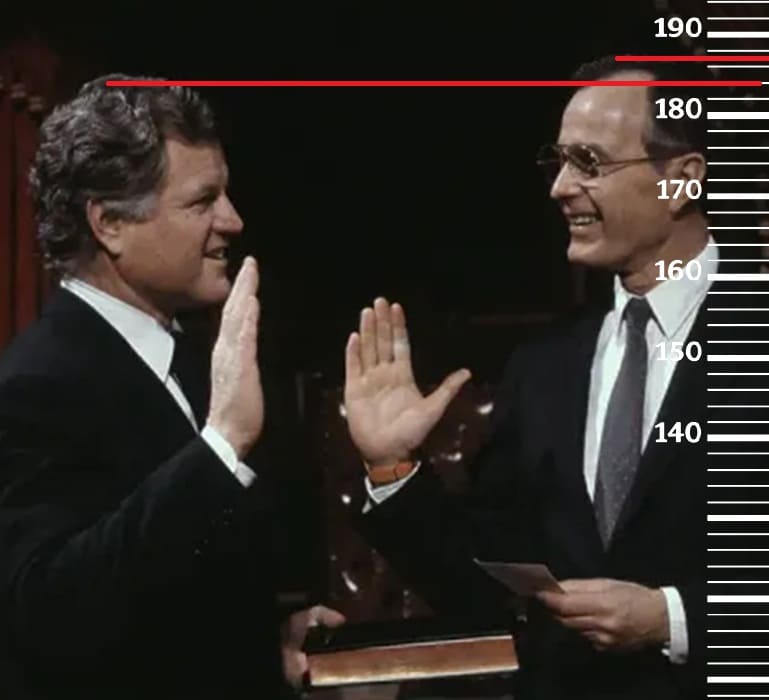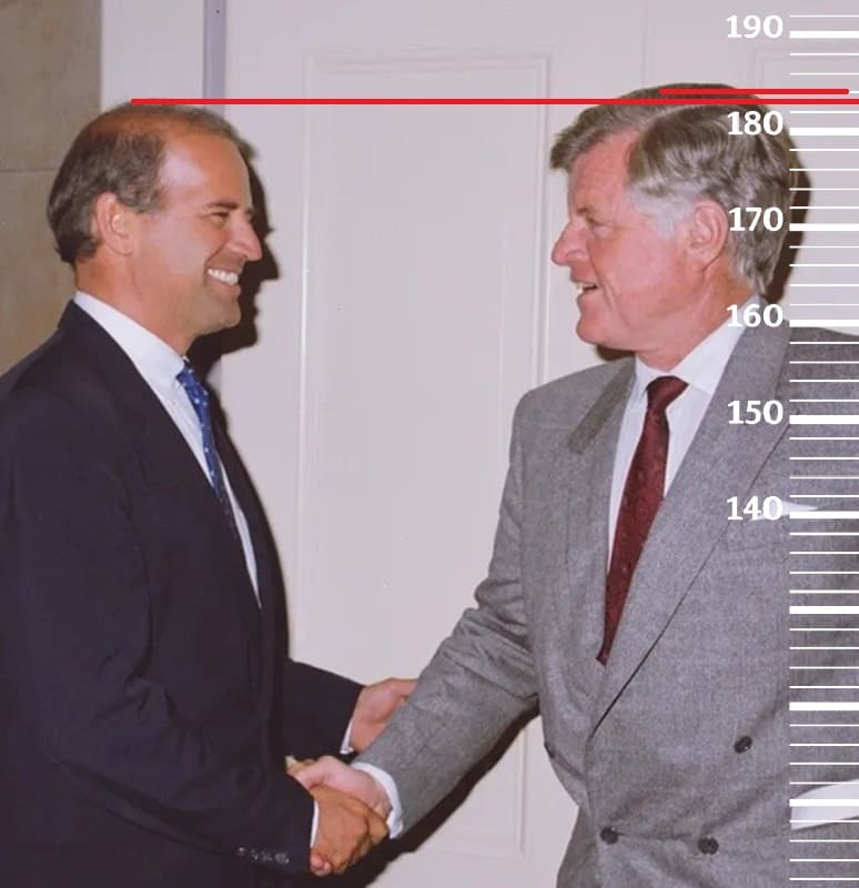В 1986-м году сравним 54-летнего Эдварда Кеннеди с 44-летним Джо Байденом, рост которого тогда был на пике формы 183 сантиметра(179 в наши дни). Здесь рост Эдварда будет также 184 сантиметра.
