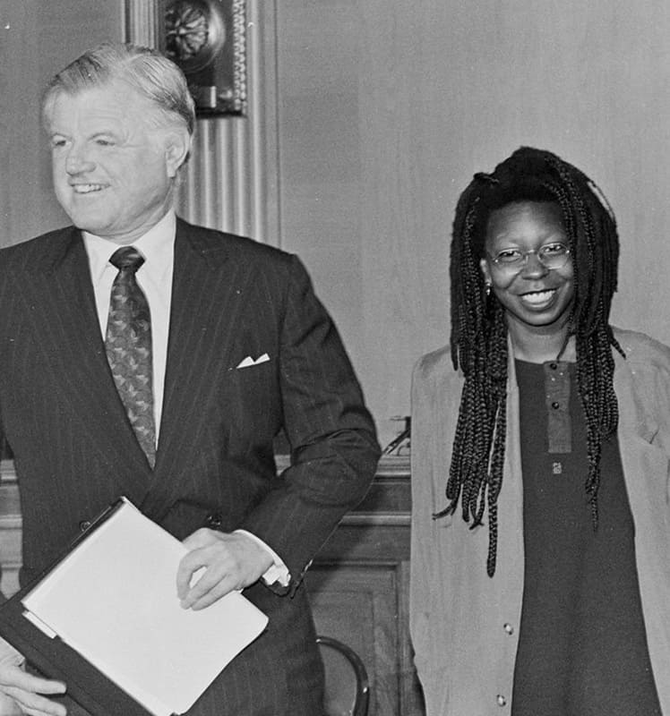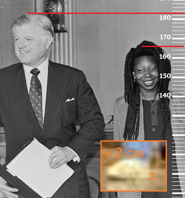 Год спустя, в 1990-м году, сравним 58-летнего Эдварда Кеннеди с 35-летней Вупи Голдберг, имевшей тогда свой пиковый рост 166 сантиметров(163 сейчас). С учётом равнозначной обуви, рост Эдварда будет также 183 сантиметра.