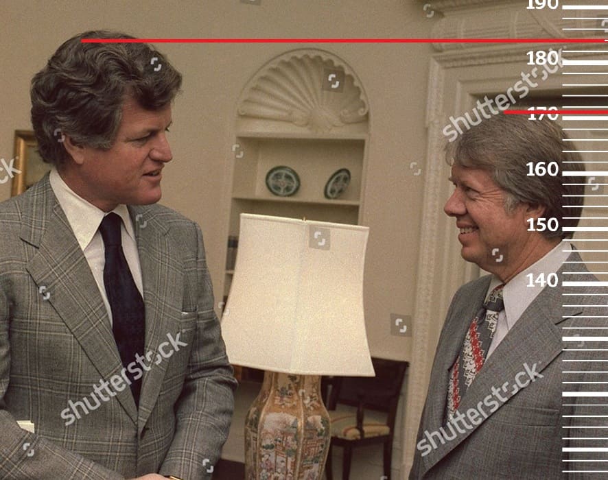 В 1980-м году сравним 48-летнего Эдварда Кеннеди с 56-летним Джимми Картером, рост которого тогда был 171 сантиметр(172 на пике формы, 166 в последние годы жизни). Здесь рост Эдварда будет уже 184 сантиметра, а значит к 48-ми годам он уже потерял первый сантиметр от своего пикового параметра роста.