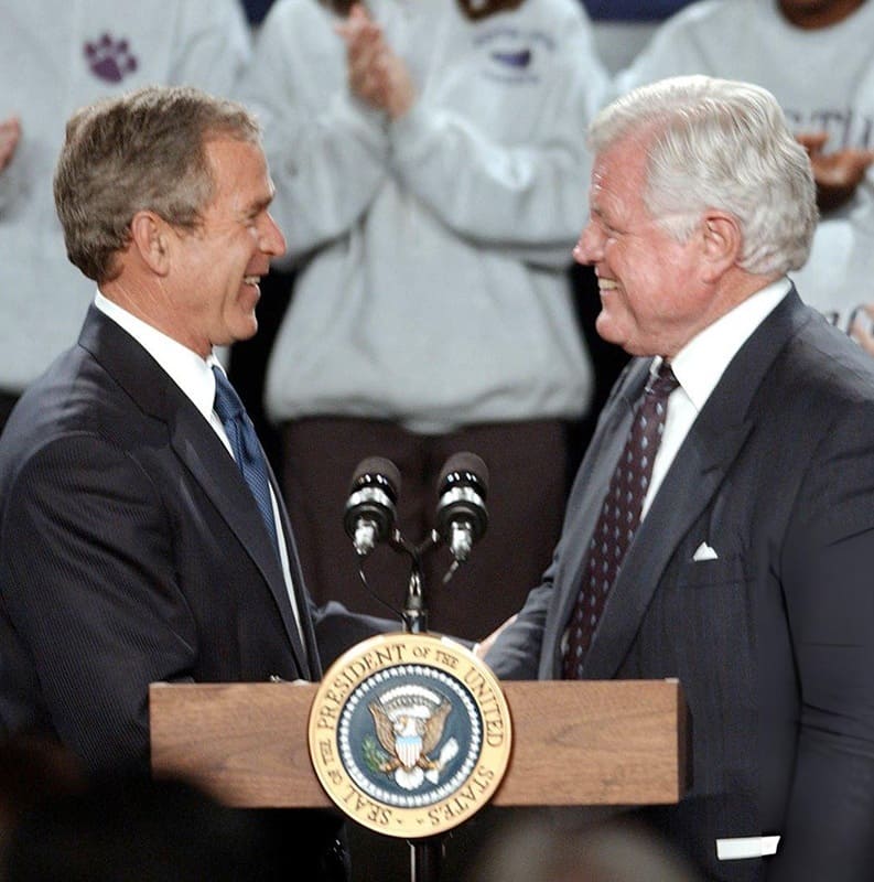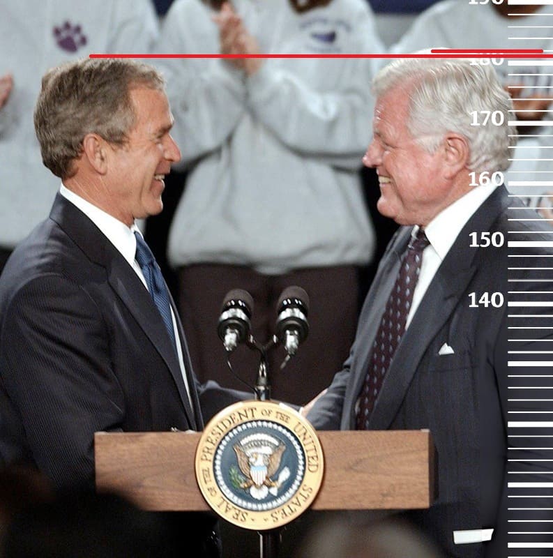 Спустя ещё один год, в2001-м году, сравним 69-летнего Эдварда Кеннеди с 55-летним Джорджем Бушем-младшим, рост которого тогда был 181 сантиметр(183 на пике формы, 179 сейчас). Здесь рост Кеннеди также будет 182 сантиметра.
