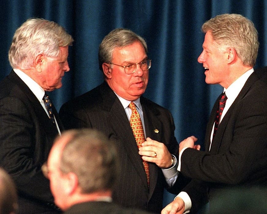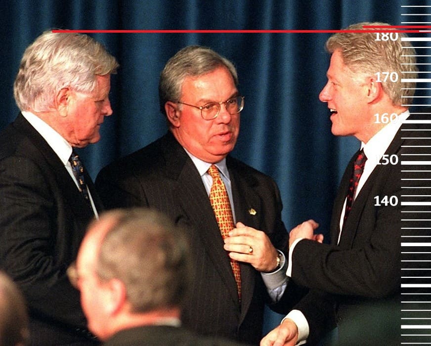 Спустя почти декаду, в 1999-м году, сравним 67-летнего Эдварда Кеннеди с 53-летним Биллом Клинтоном, рост которого тогда был 183 сантиметра(184 на пике формы, 181 в наши дни). Здесь рост Эдварда будет уже 182 сантиметра, а значит к 67-ми годам Тед потерял уже третий сантиметр от своего пикового параметра роста.