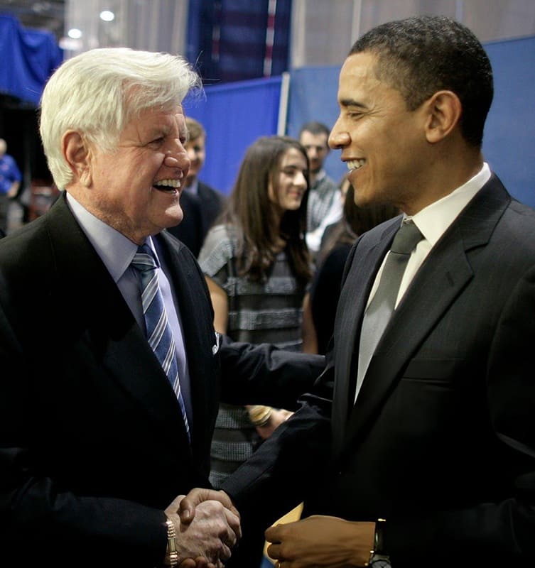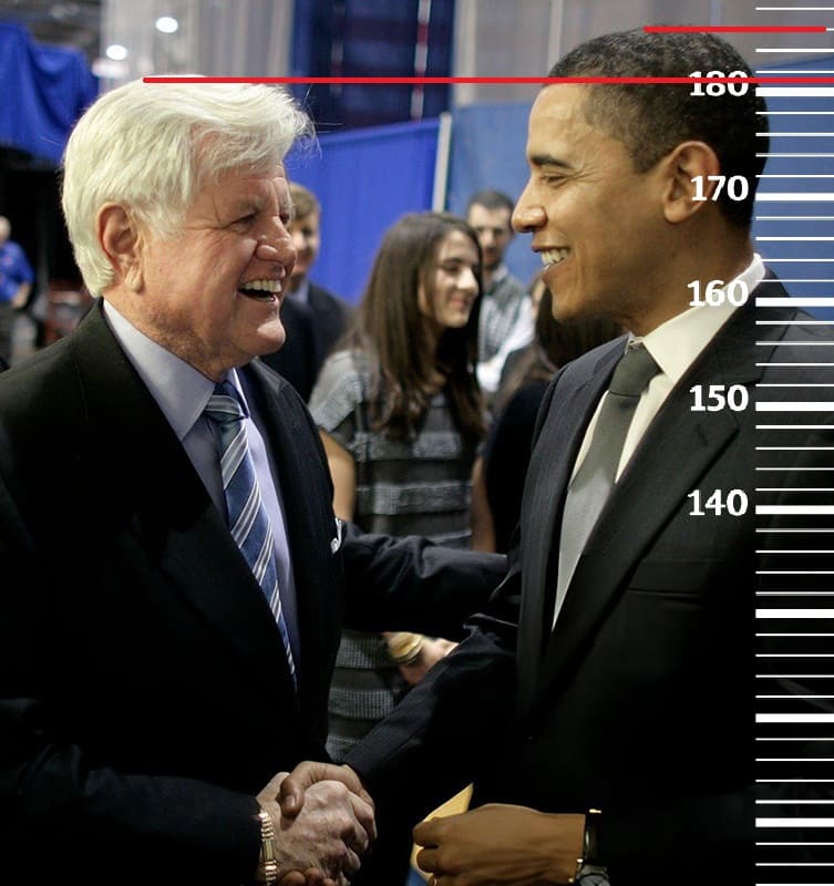 Ну и под конец, в 2009-м году, сравним 77-летнего Эдварда Кеннеди с 48-летним Бараком Обамой, рост которого в те годы был 186 сантиметров(187 на пике формы, 185 сейчас). Здесь рост Эдварда будет уже 181 сантиметр, а значит к 77-ми годам он потерял четвёртый сантиметр от своего пикового значения роста. Ну и поскольку до смерти Теда Кеннеди с момента фото остаётся всего несколько месяцев, то можно смело сказать, что больше он точно не просел, а так и покинул мир с ростом 181 сантиметр.