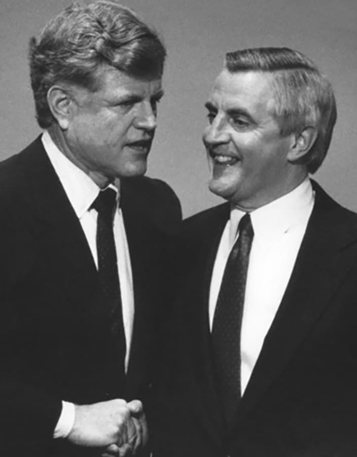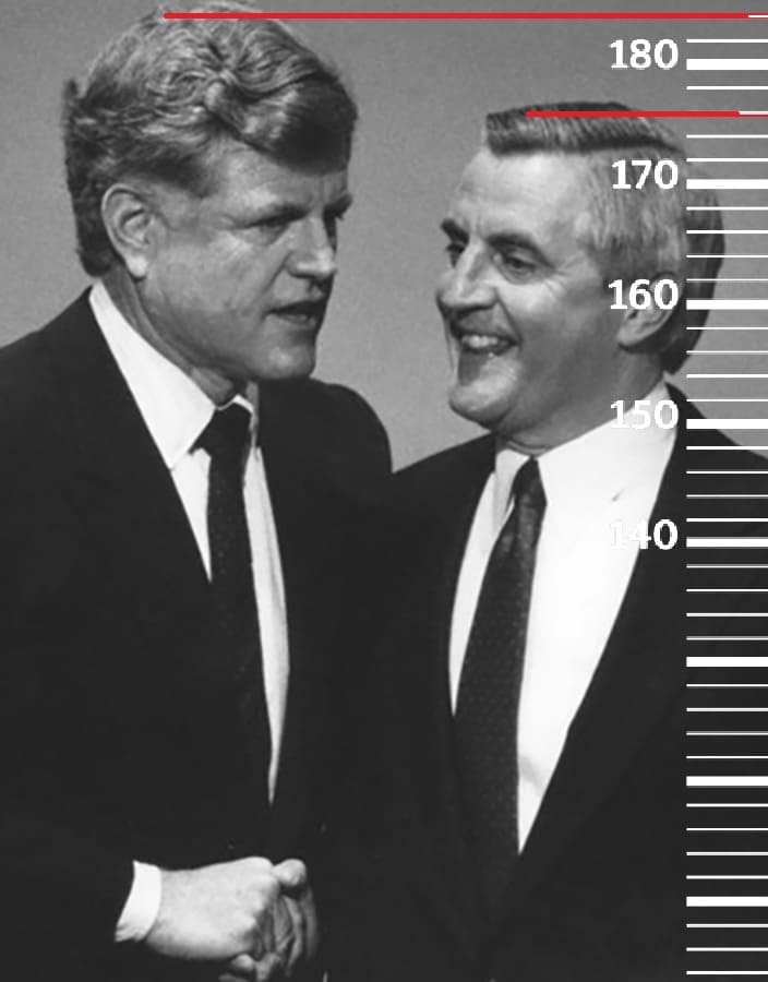 Годом позже, в 1984-м году, сравним 52-летнего Эдварда Кеннеди с 56-летним Уолтером Мондейлом, имевшим тогда рост 176 сантиметров(178 на пике формы, 173 в последние годы жизни). Здесь рост Эдварда будет на той же отметке 184 сантиметра.