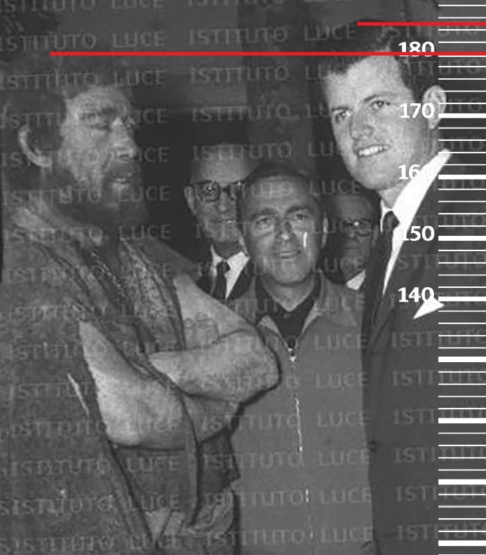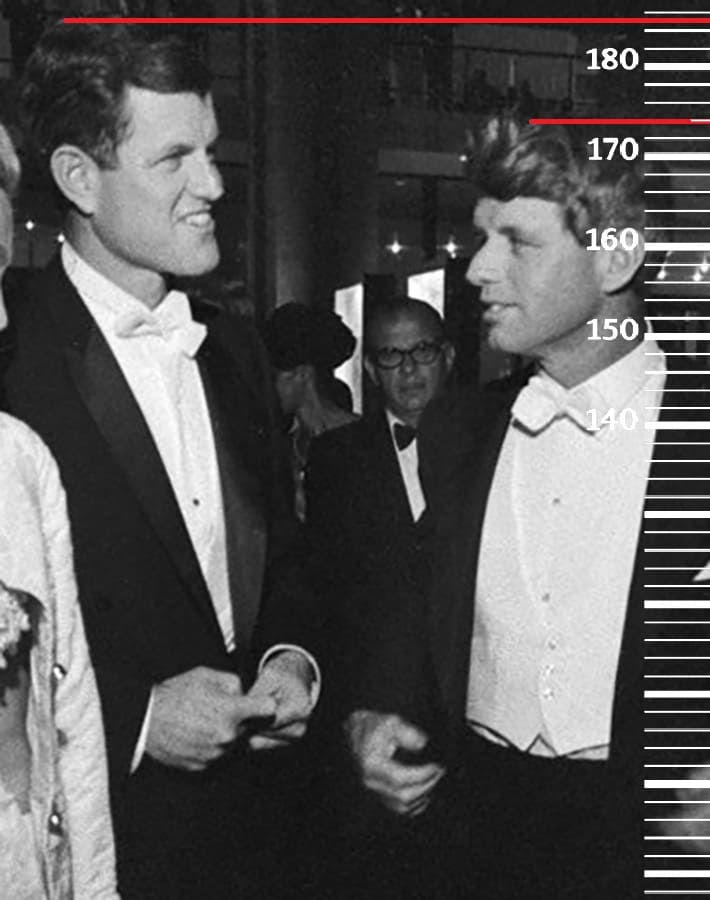 Для начала рассмотрим два фото из 1963 и 1966 годов. Сравним 31 и 34-летнего Эдварда Кеннеди с его старшим братом, 38 и 41-летним Робертом Кеннеди, рост которого при жизни в обоих случаях составлял 174 сантиметра. В обоих случаях рост Эдварда будет 185 сантиметров, что подтверждает одну из популярных отметок в сети. Ну и поскольку в 31 и 34 года рост Теда был на пике формы, то выше этих 185 сантиметров по жизни он явно не был.