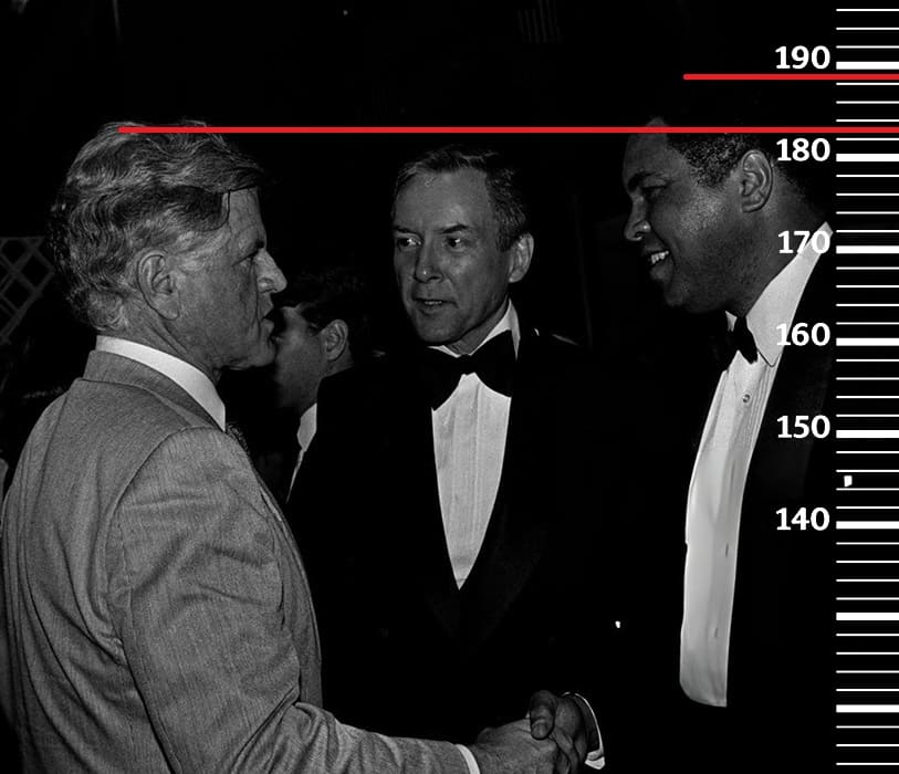 В 1989-м году сравним 57-летнего Эдварда Кеннеди с 49-летним Мухаммедом Али, рост которого тогда был 189 сантиметров(190 на пике формы. 184 в последние годы жизни). Здесь рост Эдварда будет уже 183 сантиметра, а значит к 57-ми годам он потерял уже второй сантиметр от своего пикового параметра роста.