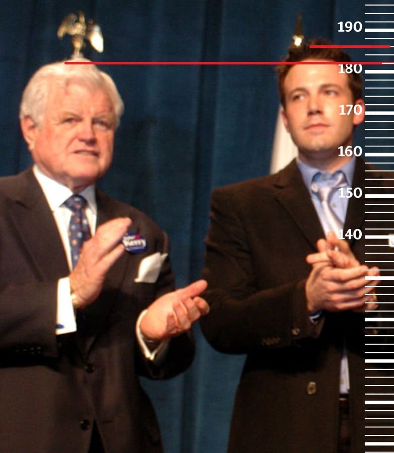 Годом позже, в 2004-м году, сравним 72-летнего Эдварда Кеннеди с 32-летним Беном Аффлеком, рост которого в те годы, ровно как и сейчас, будет 186 сантиметров. Рост Эдварда встаёт на ту же отметку 182 сантиметра.