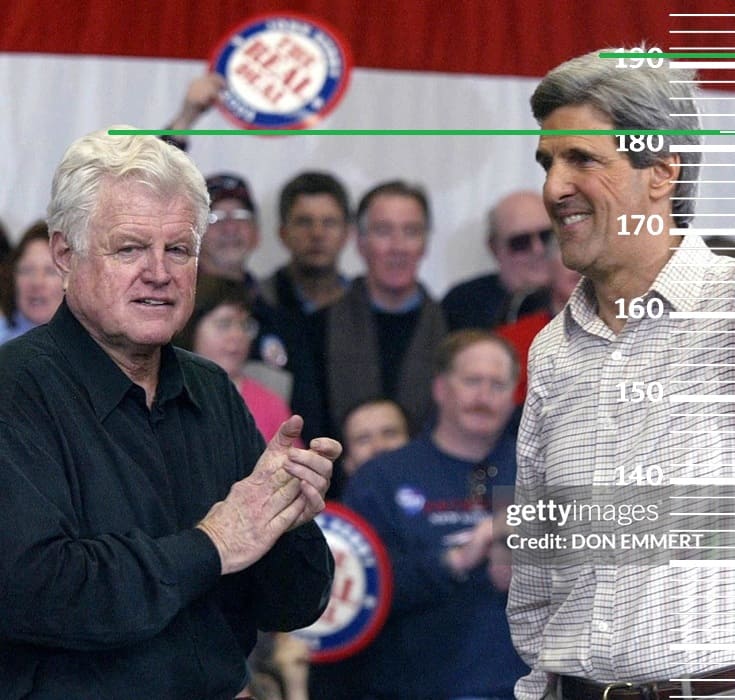 В 2003-м году сравним 71-летнего Эдварда Кеннеди с 60-летним Джоном Керри, рост которого тогда был 191 сантиметр(193 на пике формы, 189 сейчас). Здесь рост Эдварда будет на той же отметке 182 сантиметра.