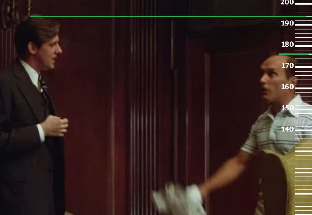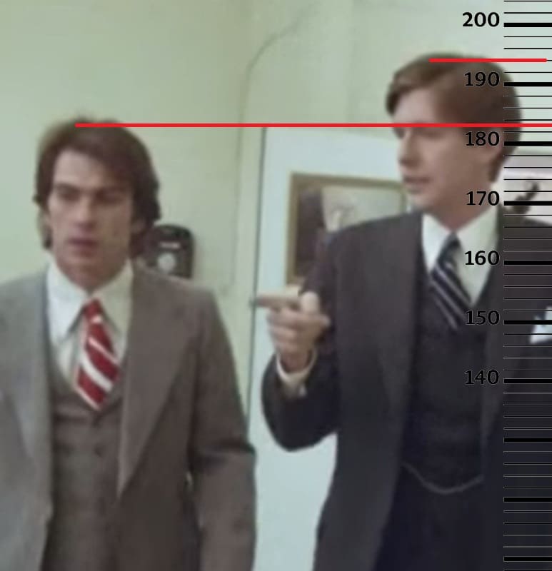 Начнём с 1974-го года. Сравним 31-летнего Эдварда Херрманна с 38-летним Брюсом Дерном, рост которого тогда был на пике формы, а именно 182 сантиметра(176 в наши дни). Здесь рост Эдварда будет уже 194 сантиметра. Ну и так как в 31 год его рост явно был на пике формы, то смело можно заявлять, что выше этих 194 сантиметров по жизни Херрманн не был.