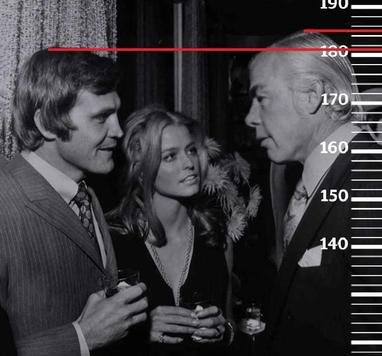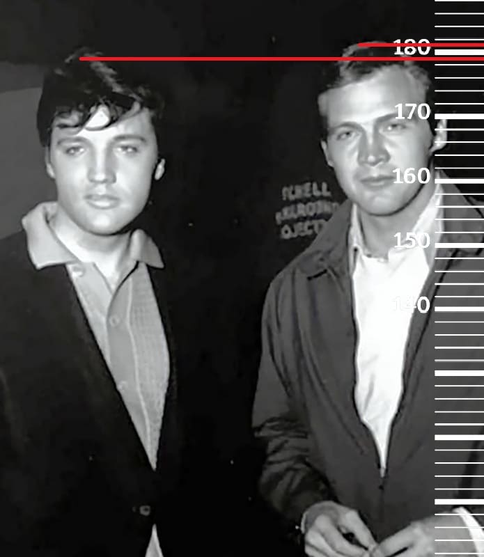 Начнём с 1966-го года. Сравним 27-летнего Ли Мэйджорса с 31-летним Элвисом Пресли, рост которого при жизни был 179 сантиметров. Как можем видеть, рост Ли будет 181 сантиметр. Ну и поскольку в 27 лет рост Мэйджорса явно был на своём пиковом показателе, то выше он по жизни точно не был.