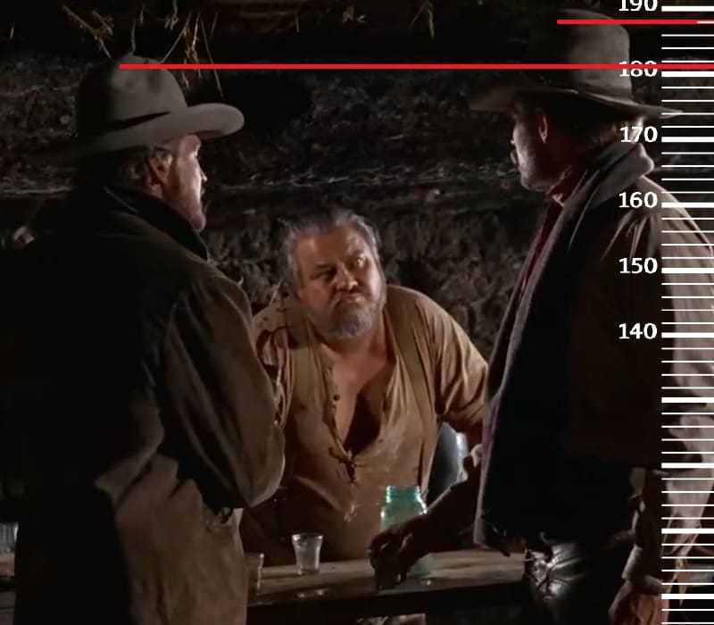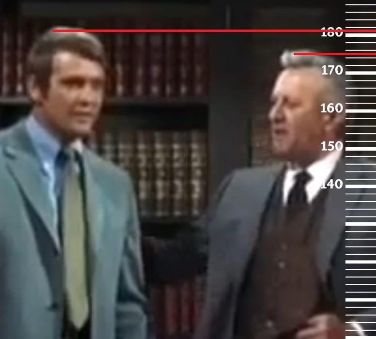 Годом позже, в 1967-м году, сравним 28-летнего Ли Мэйджорса с 44-летним Чарлтоном Хестоном, рост которого тогда был на пике формы, а именно 188 сантиметров. Здесь рост Ли также будет 181 сантиметр.