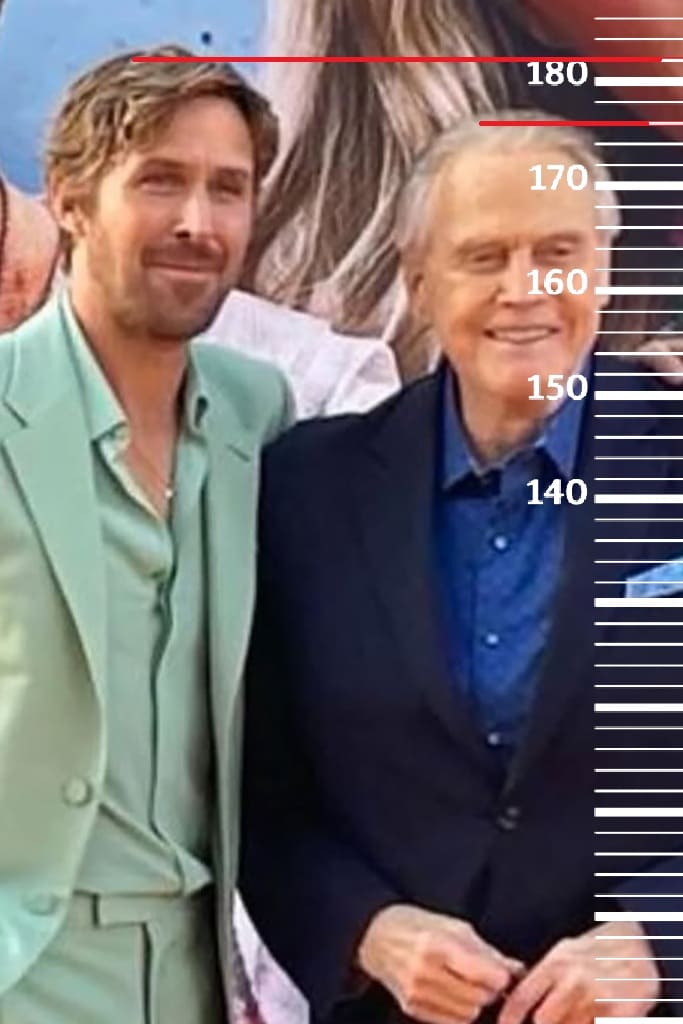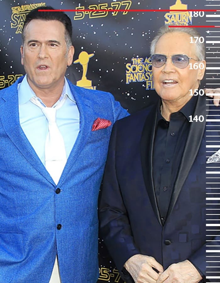 Брюс Кэмпбелл(1 фото) и Райан Гослинг(2 фото) имеют одинаковый рост по 182 сантиметра каждый. В обоих случаях рост Ли Мэйджорса вновь занимает за собой отметку 176 сантиметров.