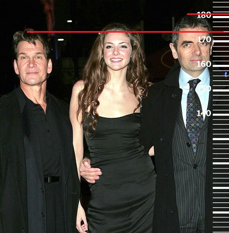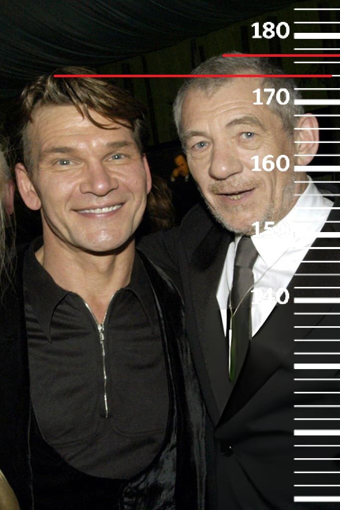 В 2005-м году сравним 53-летнего Патрика Суэйзи с 50-летним Роуэном Аткинсоном(1 фото, 181 см тогда, 182 на пике формы, 179 сейчас), 66-летним Иэном Маккелленом(2 фото, 177 см тогда, 180 на пике формы, 176 сейчас) и 49-летним Стивеном Бауэром(3 фото, 183 см тогда, 184 на пике формы, 181 сейчас). Во всех трёх случаях рост Суэйзи будет на тех же 174 сантиметрах.