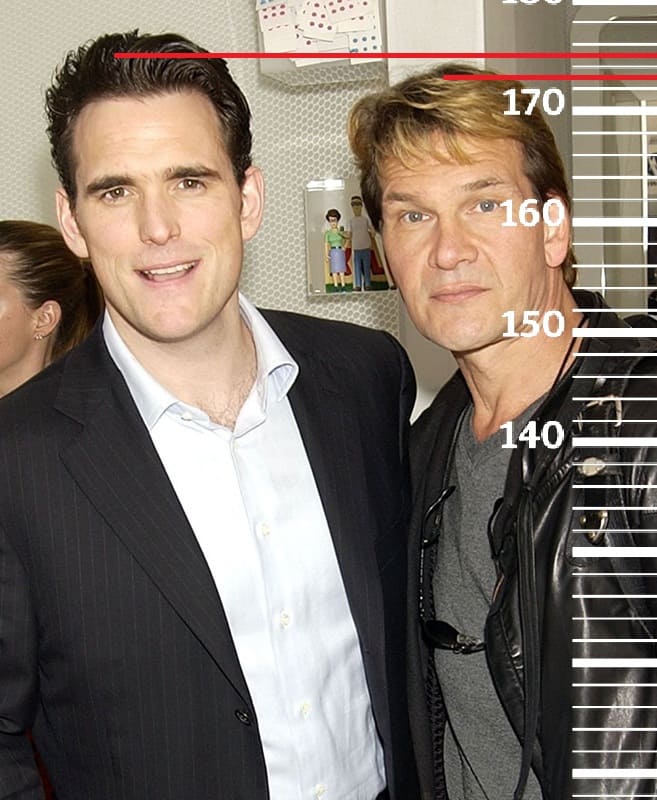 В 2007-м году сравним 55-летнего Патрика Суэйзи с 43-летним Мэттом Диллоном, имевшим тогда свой пиковый рост 175 сантиметров(174 сейчас). Здесь рост Патрика будет уже 173 сантиметра, а значит к 55-ти годам он потерял уже второй сантиметр от своего пикового параметра роста.
