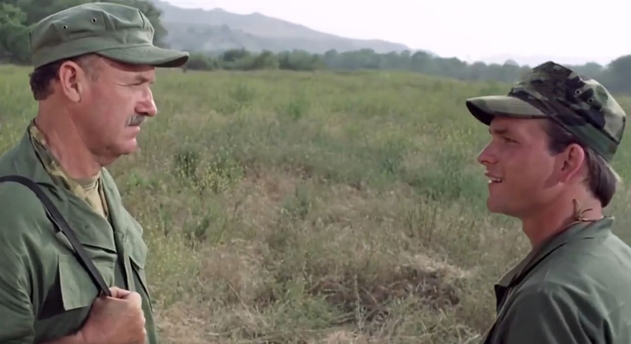 В том же 1983-м году сравним такого же 31-летнего Патрика Суэйзи с 53-летним Джином Хэкменом, рост которого тогда составлял 186 сантиметров(187 на пике формы, 182 в конце жизни). Здесь рост Патрика также будет 175 сантиметров.