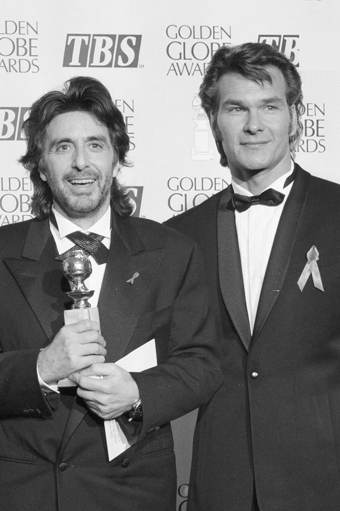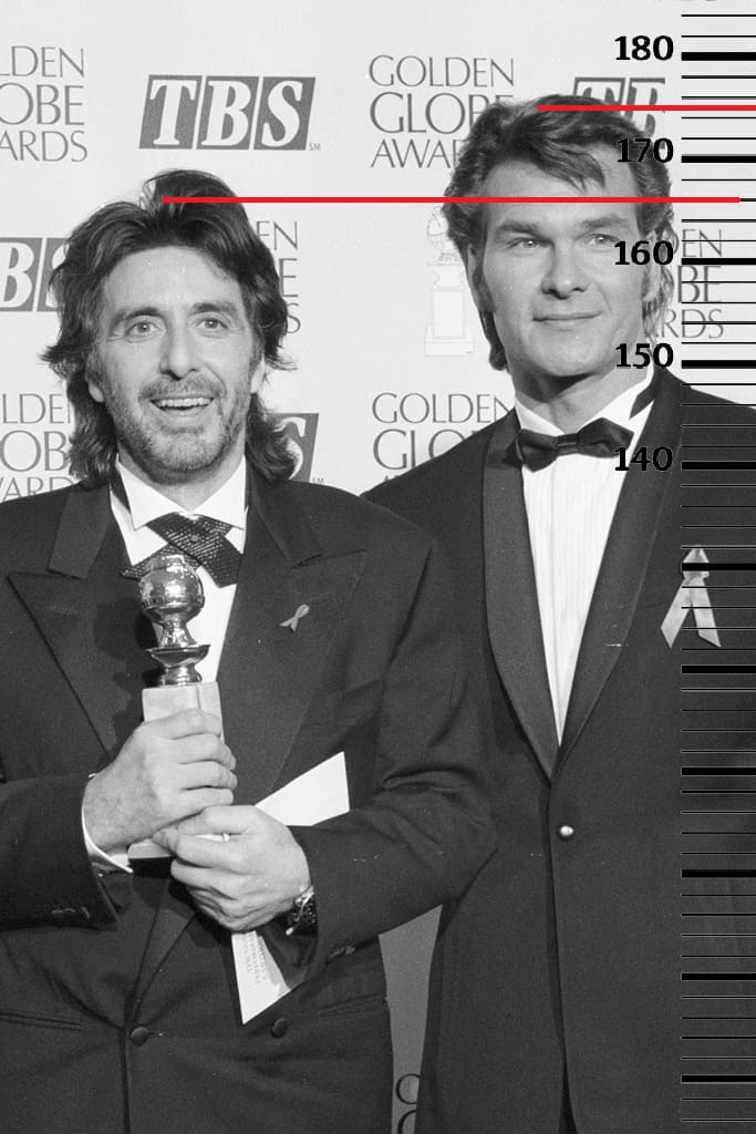 Спустя ещё один год, в 1993-м году, сравним 41-летнего Патрика Суэйзи с 53-летним Аль Пачино, рост которого тогда составлял 166 сантиметров(167 на пике формы, 163 сейчас). Здесь рост Патрика вновь будет на своей пиковой отметке 175 сантиметров.