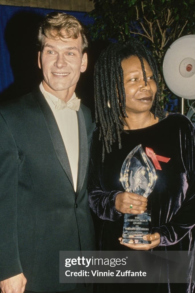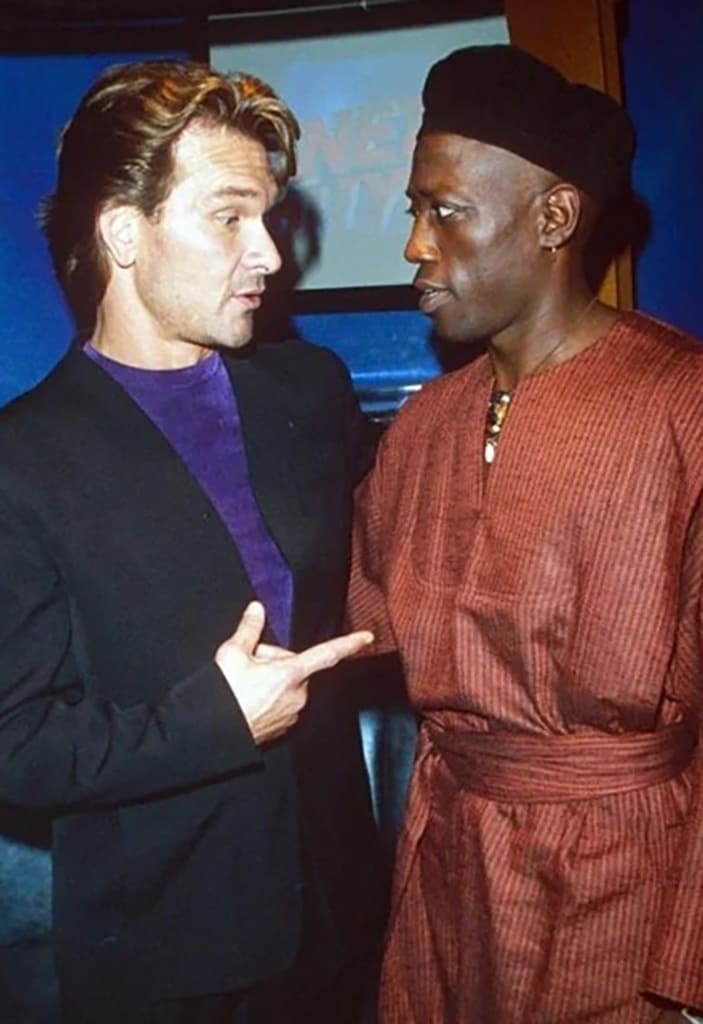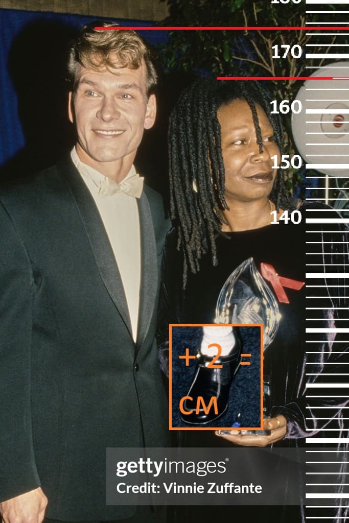 В 1995-м году сравним 43-летнего Патрика Суэйзи с 33-летним Уэсли Снайпсом(1 фото) и 40-летней Вупи Голдберг(2 фото, обувь равнозначна). Рост обоих сравниваемых с Патриком знаменитостей на тот момент - пиковый, а именно 176 и 166 сантиметров, соответственно (175 и 163 в наши дни). В обоих случаях рост Суэйзи будет на той же отметке 175 сантиметров.