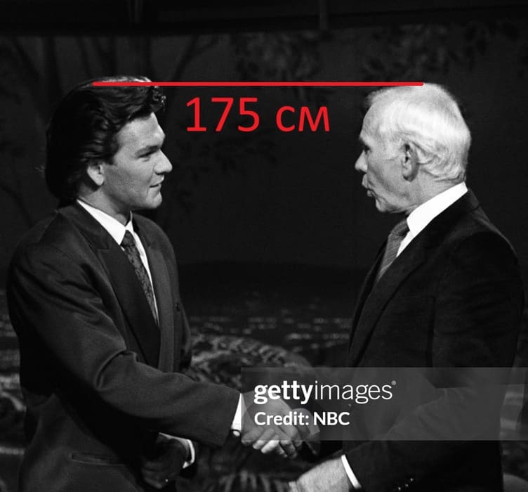 В 1988-м году сравним 36-летнего Патрика Суэйзи с 63-летним Джонни Карсоном, рост которого тогда был 175 сантиметров(177 на пике формы, 174 в поздние годы). На тот момент рост мужчин был одинаков, то есть также 175 сантиметров.