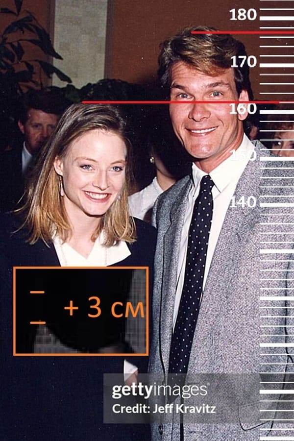 Годом позже, в 1992-м году, сравним 40-летнего Патрика Суэйзи с 30-летней Джоди Фостер, рост которой тогда был на пике формы, а именно 159 сантиметров(162 на каблуках, 157 сейчас). Здесь рост Патрика будет уже 177 сантиметров, но если мы вычтем его обувь, то также получим отметку, не превышающую 175 сантиметров.
