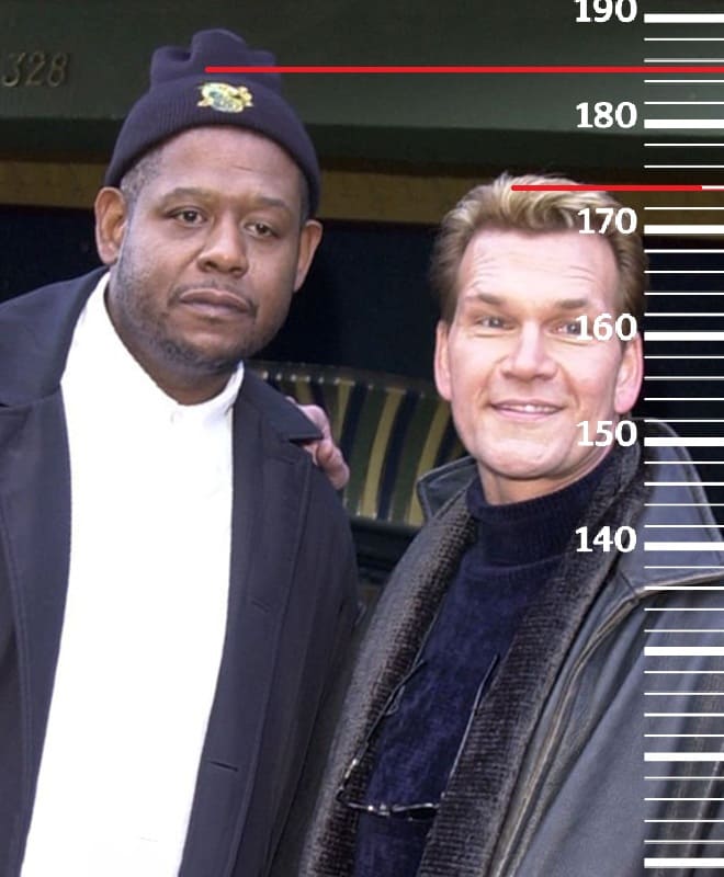В 2001-м году сравним 49-летнего Патрика Суэйзи с 40-летним Форестом Уитакером, имевшим тогда свой пиковый рост 186 сантиметров(184 сейчас), но из-за сутулости он будет чуточку ниже. Здесь рост Патрика в в сравнении с ним будет уже 174 сантиметра, а значит к 49-ти годам Суэйзи уже потерял первый сантиметр от своего пикового роста.