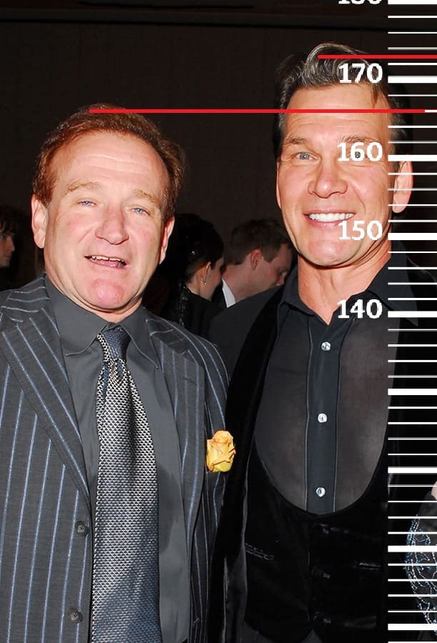 Годом позже, в 2008-м году, сравним 56-летнего Патрика Суэйзи с 57-летним Робином Уильямсом, рост которого в последние годы жизни составлял 166 сантиметров(168 на пике формы). Здесь рост Патрика будет также 173 сантиметра.