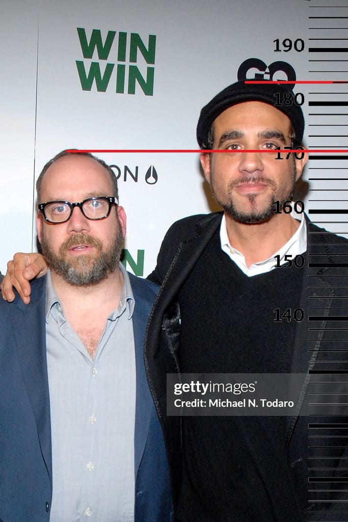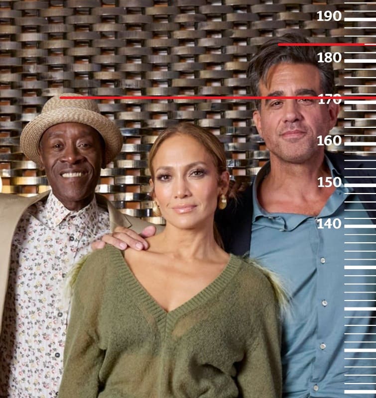 Дон Чидл(1 фото), Пол Джаматти(2 фото) и Джеймс Корден(3 фото) имеют одинаковый рост по 171 сантиметру каждый. Во всех трёх случаях рост Бобби Каннавале также стойко сохраняет за собой отметку 184 сантиметра.